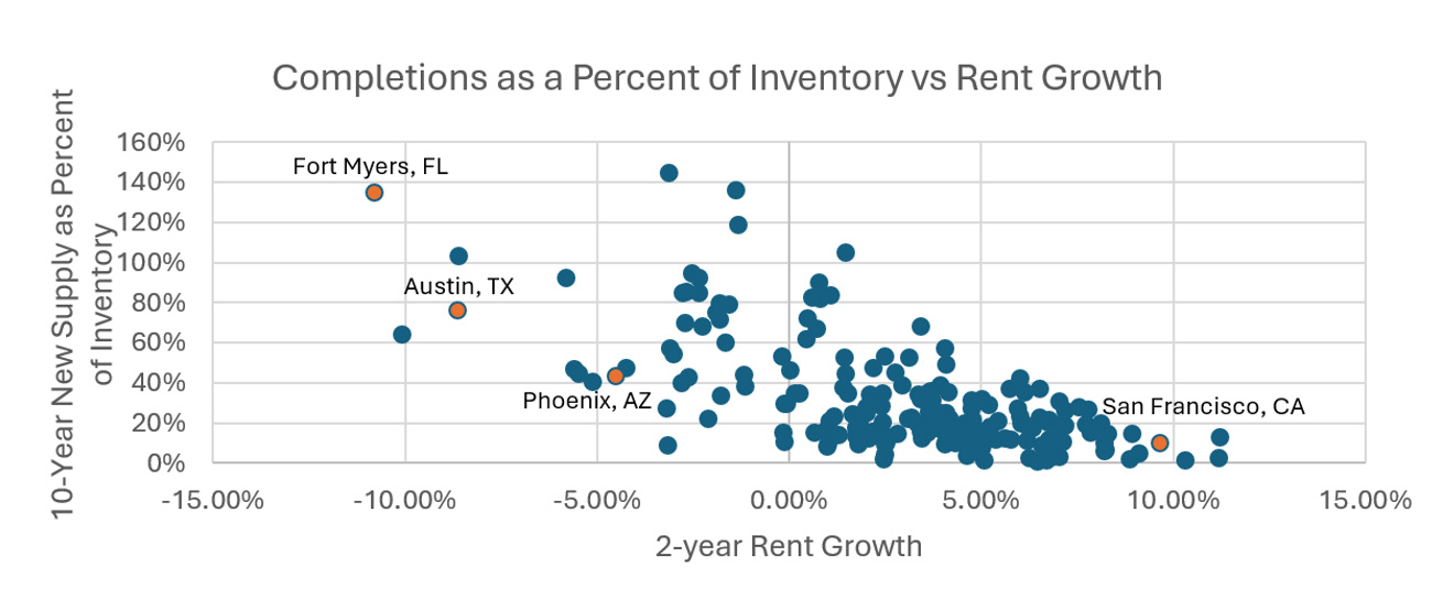 Perhaps unsurprisingly, markets experiencing rent softness have one thing in common: a surge in new supply. Over the past decade, markets exhibiting recent rent declines saw inventory grow by more than 50% on average – over twice the pace of markets currently exhibiting rent growth. Despite strong population growth, 36 of these major markets now have vacancy rates above 8 percent with many major markets like Austin, Dallas, Houston, Pheonix and Denver, seeing vacancy rates above 12 percent.