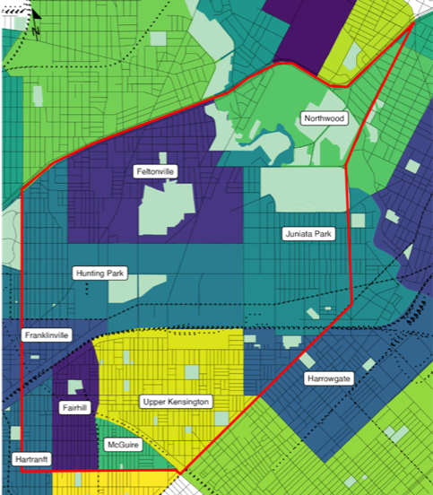 Figure 2: Eastern North Philadelphia (in red) with neighborhood boundaries and labels